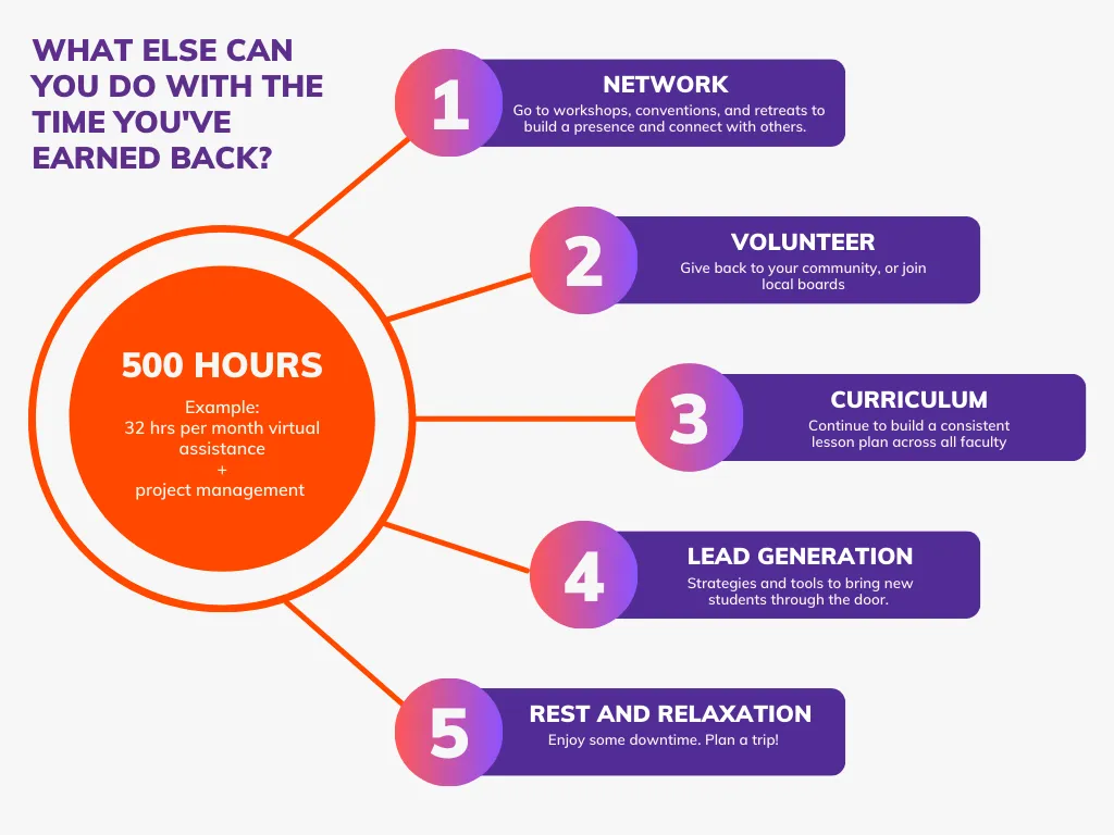 Delegate some tasks so you can concentrate on networking, curriculum building, lead generation, and some much needed rest and relaxation.